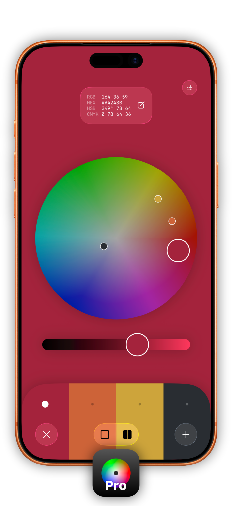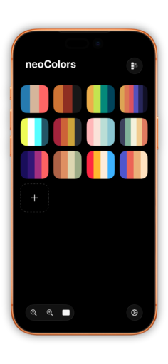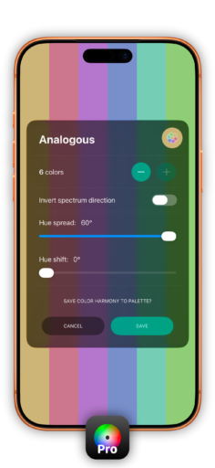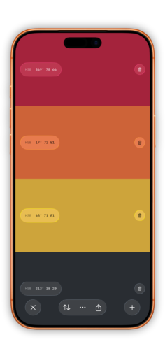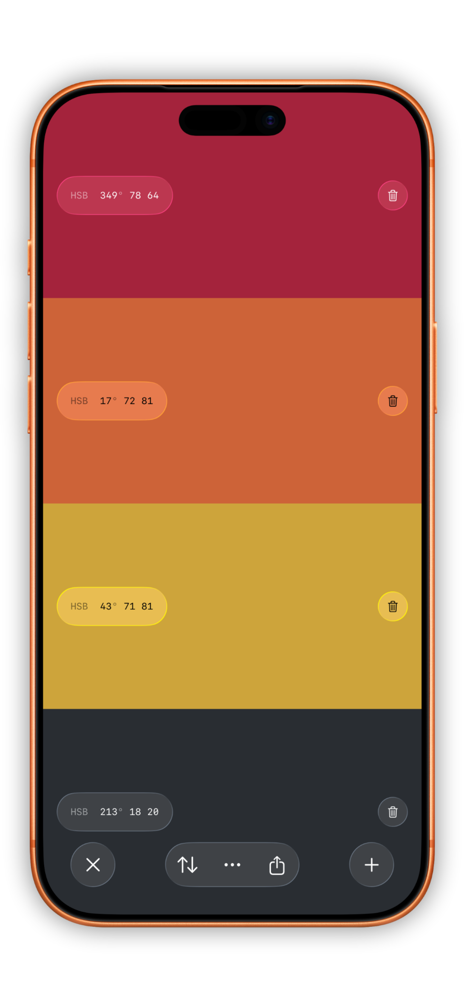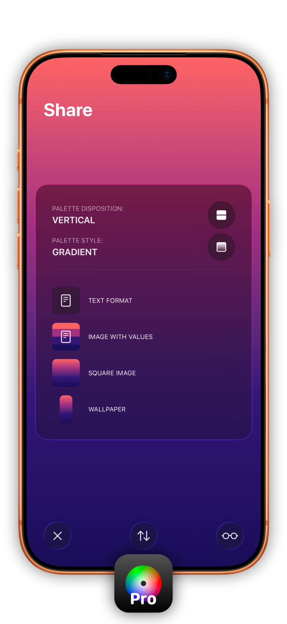 - Share palettes as values, palette images and device wallpapers (flat or gradient).
